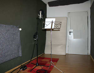 Kleiner aber feiner Gesangsraum mit vormikrofoniertem Neumann U87 für den schnellen Zugriff. Auch für Aktustikinstrumente sehr gut geeignet